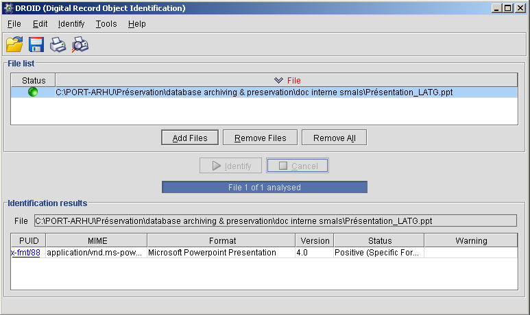 Le format n’est donc plus supporté par la version standard de MS Powerpoint que nous utilisons (obsolescence de format). Le fichier est-il si vieux ? Pour le savoir, il faut faire appel à des outils d’identification de format. Dans ce cas-ci, j’ai utilisé DROID, un logiciel open source créé par les Archives National anglaises.