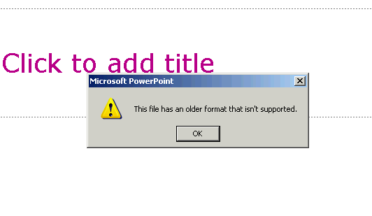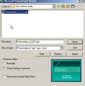 Il s’agit donc de la version 4.0 de Powerpoint (merci DROID) et donc la version de 1993 (merci wikipedia). Maintenant, il ne me reste plus qu’à trouver un logiciel capable de lire le fichier. Le plus simple dans ce cas-ci est d’utiliser un format viewer vu que je ne souhaite que consulter le fichier et pas le modifier (voir chapitre 5.4.3 de notre étude).