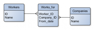 Supposons maintenant qu’un travailleur puisse travailler pour plusieurs employeurs (on veut donc une relation “many-to-many”). Ou bien que l’on souhaite ajouter des attributs à la relation de travail (date de début, …). Le modèle ci-dessus ne tient plus, et il faut rajouter une “table de jointure” (“join table“) que nous appellerons “Works_for”. La structure est alors représentée par le schéma ci-contre. Nous avons donc maintenant deux tables qui décrivent des entités (Workers et Companies), et une table qui décrit une relation (Works_for). Fondamentalement, mise à part l’utilisation qu’on en fait, rien ne permet de distinguer les tables qui jouent le rôle d’entité, de celles qui jouent le rôle de relation. En général, les tables représentant des entités peuvent être caractérisées par un nom commun (personne, société, facture, produit…), alors que les tables représentant des relations seront plus caractérisées par des verbes (travaille pour, achète, contient…).