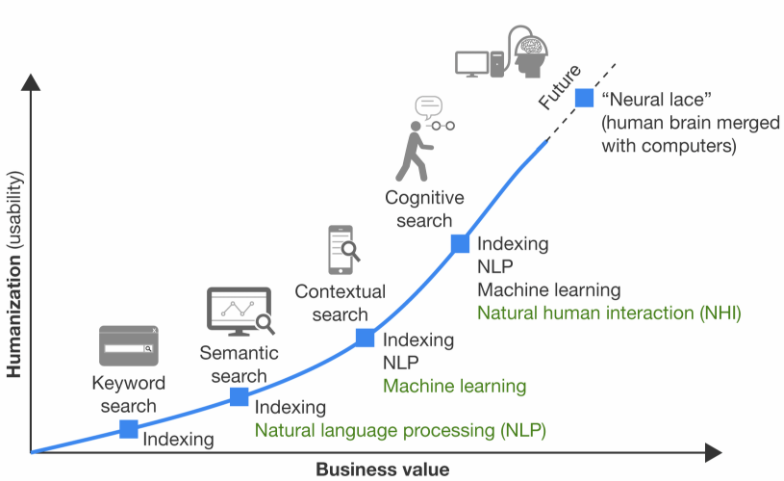 Une nouvelle approche du enterprise search dite cognitive search, a été développée dans l’optique d’exploiter au mieux les données contenues dans les documents de l’entreprise et de proposer des résultats plus ciblés ; le cognitive search permet d’aller plus loin en intégrant le traitement automatique du langage naturel (NLP) et l’intelligence artificielle. Ces techniques sont utilisées pour enrichir l’information, elles permettent au système d’interpréter la requête et de proposer un résultat ciblé et pertinent. Cette approche est dite cognitive car elle tient compte du contexte et des préférences de l’utilisateur pour la recherche et s’améliore avec l’utilisation. On peut la caractériser par les points suivants :