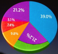 Un outil comme Excel vous permet – pour ne pas dire vous y incite – de rajouter des effets de perspective à vos graphiques. Si le résultat peut être visuellement élégant, il sera bon de s’en servir avec parcimonie, car il est particulièrement trompeur. ApplePrenons l’exemple d’un graphique en tarte : non seulement les segments qui apparaîtront du côté du lecteur seront augmentés d’une “tranche” que n’auront pas les segments opposés, mais par ailleurs la perspective diminuera la surface les segments les plus éloignés. Dans l’exemple ci-contre, on peut voir Steve Jobs, en pleine “Keynote”, présentant la répartition du marché des principaux vendeurs de smartphones. Apple (19.5 %), en vert, occupe une surface à l’écran 1.8 fois supérieure à celle occupée par le segment “Autres” (21.2 %), en violet !Apple2 On a donc, pour la comparaison entre ces deux éléments, un lie factor proche de 10 ! Pour mieux visualiser la “tromperie”, voici ci-contre une version du graphique dans lequel on superpose le segment violet des 21.2 % à celui, vert, des 19.5 %. En théorie, le vert devrait donc avoir complètement disparu. Jugez-en par vous-même…