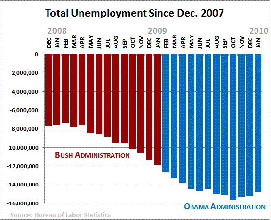 On peut d’abord remarquer trois stratagèmes simples utilisés dans ce graphique pour accentuer le point de vue de l’auteur. Le premier a déjà été présenté avec l’exemple du parti socialiste français ci-dessus, et consiste à “retourner” le diagramme en bâton. On a donc quelque chose en décroissance sous l’administration Bush, qui accentue l’aspect dramatique, et en croissance sous celle d’Obama, pour accentuer le sentiment de progrès et de rétablissement. Par ailleurs, on voit un bleu clair, lumineux, pour la partie d’Obama et un rouge foncé, sombre pour celle de Bush. Ce n’est certainement pas innocent. Enfin, la légende indique le graphique va de 2007 à 2010. Si l’on ne fait pas attention aux mois, on pourrait penser que le graphique couvre 3, voire 4 ans, et qu’il s’agit donc d’une progression durable. Or le graphique concerne essentiellement 2008 et 2009 (décembre 2007-janvier 2010), soit à peine plus de deux ans.