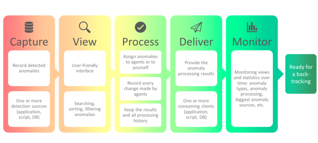 - De verwerking van anomalieën: de interface stelt functies beschikbaar die kunnen worden aangeroepen door een frontend ontworpen voor business agents die anomalieën verwerken (corrigeren, valideren, enz.).