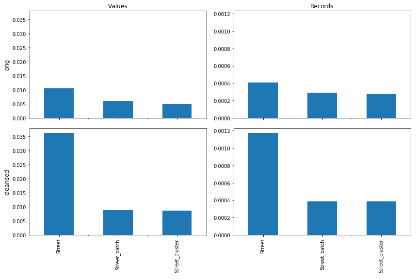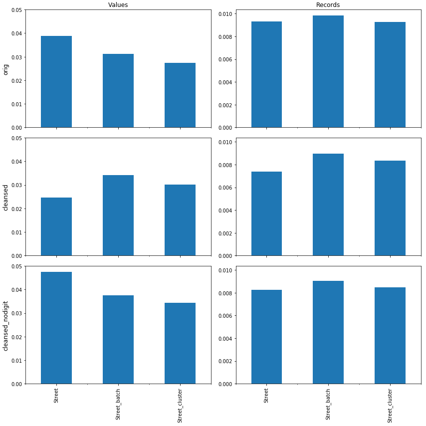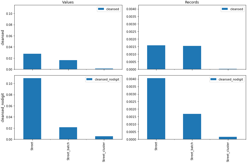 La figure 1, ci-dessus, reprend les valeurs pour le dataset utilisé. On y voit par exemple qu’après le nettoyage le plus complet (cleansed_nodigit) appliqué sur les données d’origine (Street), presque 11 % des valeurs (0.4 % des données) distinctes présentes dans les données sont identiques à une autre valeur. Ce nombre chute à 0.5 % des valeurs (0.01 % des données) après le nettoyage effectué dans la colonne “Street_cluster”, ce qui illustre le gain important des opérations.