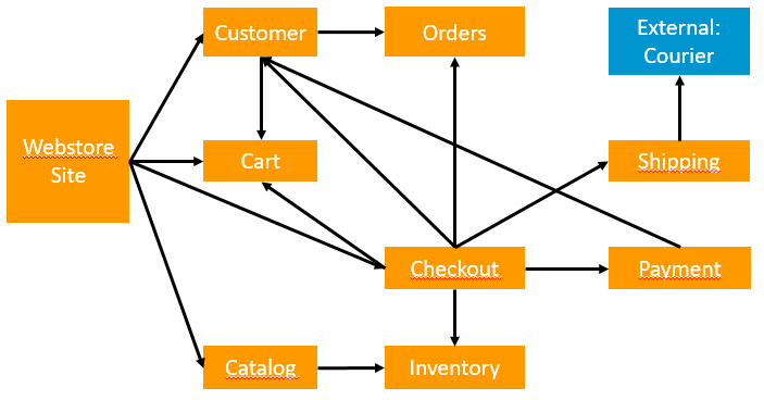 Zoals we kunnen zien heeft de microservices approach al een voordeel tegenover de monolithische aanpak: er mogen een paar services plat zijn, en mensen kunnen toch winkelen (zonder in te loggen zijn enkel cart, catalog en eventueel inventory nodig). Enkel tijdens een checkout zijn zowat alle services nodig (behalve de catalog).