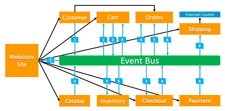 - De Orders Service ziet event 5 en stuurt zelf een event (“Order Ready-to-Pack”-Event 6 )