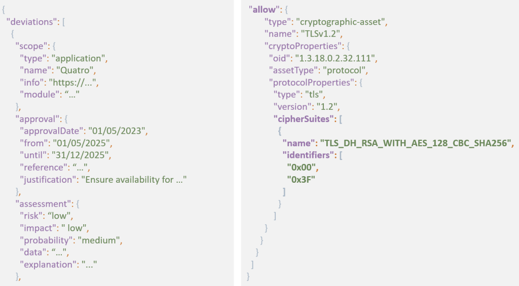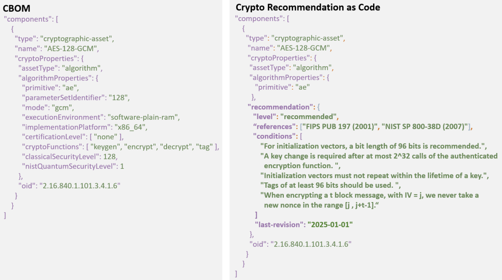 Dans la partie gauche de l’illustration ci-dessous, la description de l’AES-128-GCM est présentée selon le modèle CBOM. On y trouve notamment des informations sur le niveau de sécurité classique et le niveau de sécurité quantique. Dans la partie droite de l’illustration se trouve notre proposition de formulation des recommandations sous forme de code. Nous maximisons ainsi la compatibilité avec CBOM ; la structure, la nomenclature et les clés d’identification sont conservées. Dans le même temps, nous évitons la duplication des données que nous trouvons déjà dans la description CBOM.