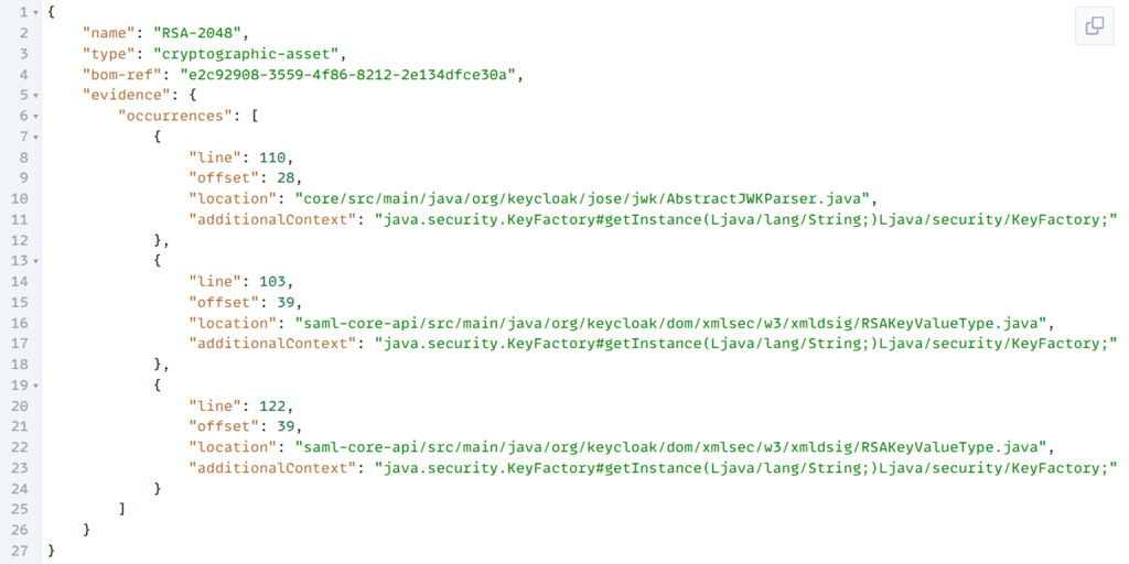Eu égard à cette perspective, nous intégrons autant que possible nos propositions de CPaC dans le modèle CBOM. L’illustration ci-dessous est le résultat d’une analyse statique du code et montre dans le code CBOM que RSA-2048 est utilisé à trois endroits dans une application.