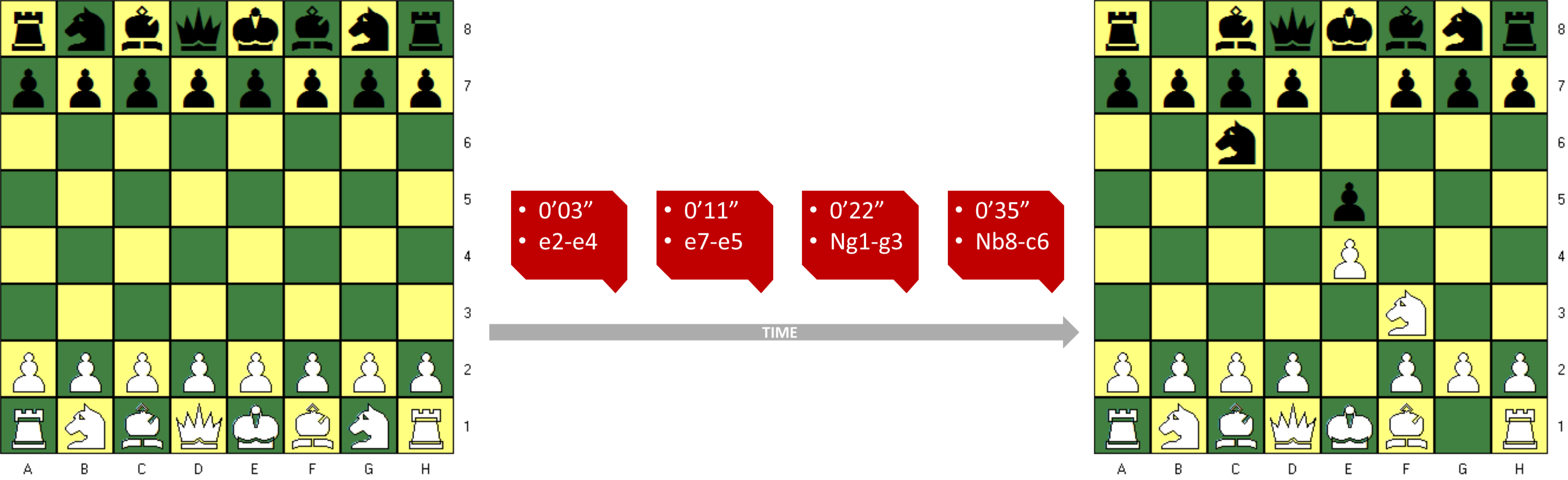 Event Sourcing in het schaakspel: de huidige toestand van het spel wordt bekomen door de opeenvolgende zetten toe te passen op het bord in de begintoestand. Door de zetten op te slaan in plaats van enkel het bord, krijgen we een veel rijker inzicht in hoe dit spel is geëvolueerd.
