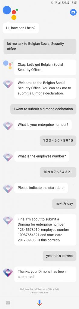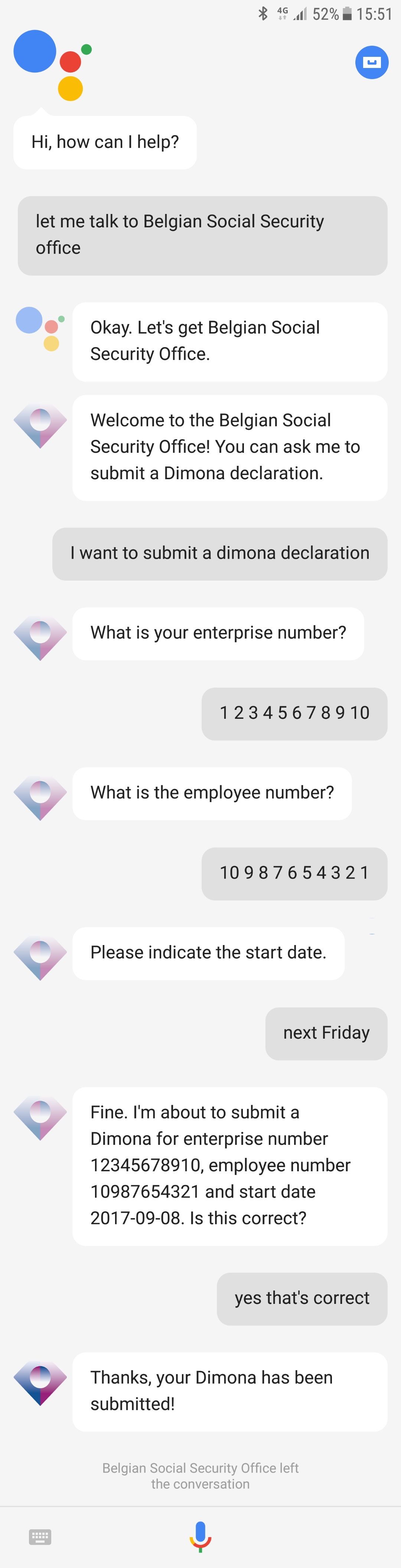 Naast de standaard features die Google zelf aanbiedt (zoals informatie opzoeken of muziek afspelen), kan je eigen “actions” toevoegen aan de assistent. Zo hebben we binnen het research team van Smals een experiment opgezet met een Dimona action. Dimona staat voor “Declaration immédiate – Onmiddellijke aangifte” en slaat op het elektronisch bericht waarmee de werkgever iedere indiensttreding en uitdiensttreding van een werknemer aangeeft bij de RSZ. Doel is om aan te tonen hoe een Dimona-aangifte kan doorgestuurd worden op een totaal andere manier als de bestaande kanalen, namelijk via een tekst- of spraakgebaseerde conversatie. We spreken dan ook van een conversationele interface (zie de inleidende blogpost over conversationele interfaces).
