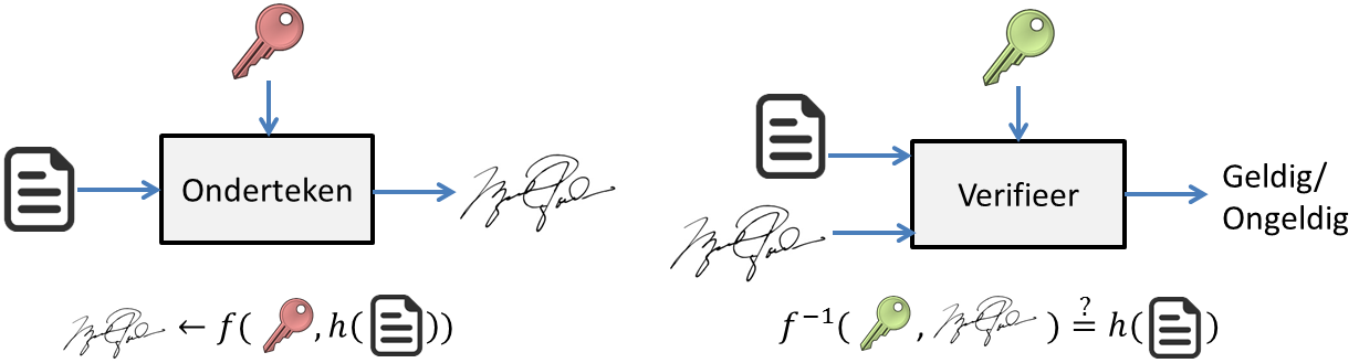 Naast het algoritme om het publiek-privaat sleutelpaar te genereren zijn er twee algoritmes van belang: Het ondertekenalgoritme en het verifieeralgoritme zoals geïllustreerd in figuur 1. In het ondertekenalgoritme generereert een ondertekenaar met zijn private sleutel een handtekening voor een specifiek bericht. De ondertekenaar berekent daartoe de hashwaarde van het bericht, wat een unieke fingerprint is met een vaste, korte lengte. Vervolgens doet hij op die hashwaarde een cryptografische operatie die zijn private sleutel vereist. (Met de publieke sleutel kan enkel de inverse berekend worden). Het resultaat is de handtekening, die samen met het bericht en eventueel het certificaat naar de ontvanger gestuurd wordt. De ontvanger kan nu met het verifieeralgoritme nagaan of de handtekening geldig is. Met behulp van de publieke sleutel berekent hij op de handtekening de inverse van de eerder vermeldde cryptografische operatie. Het resultaat daarvan moet gelijk zijn aan de door de ontvanger berekende hashwaarde van het bericht.