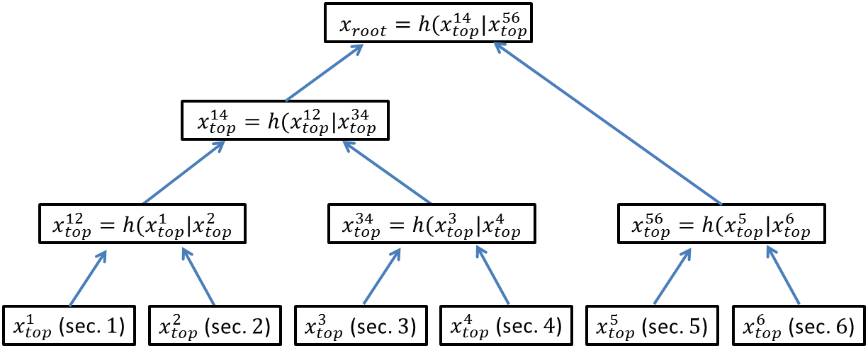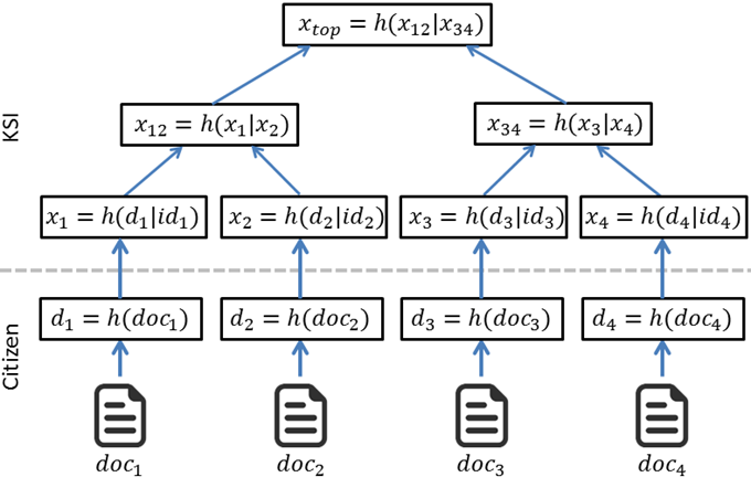 De KSI groepeert elke seconde opnieuw alle dergelijke hashwaarden van de laatste seconde. In figuur 2 zijn dit x1, x2, x3 en x4. Deze waarden van de laatste seconde worden paarsgewijs samengenomen en van deze paren wordt opnieuw de hashwaarde berekend (x12=h(x1|x2) en x34=h(x3|x4) in figuur 2). Vervolgens wordt deze stap nog eens overgedaan voor deze nieuw hashwaarden (xtop=h(x12|x34)). We gaan zo door tot we één waarde hebben in de top. Zo kan voor een willekeurig aantal documenten een zogenaamde Merkle tree opgesteld worden, met telkens bovenaan één waarde xtop. Voor grote aantallen ingestuurde hashwaarden zal de Merkle tree uiteraard meer niveaus tellen. Elke seconde wordt de nieuwe xtop waarde gepubliceerd, naast de oudere waarden. Op één dag worden zo dus 60*60*24=86400 xtop-waarden gepubliceerd. Een typische grootte voor één waarde is 256 bit.