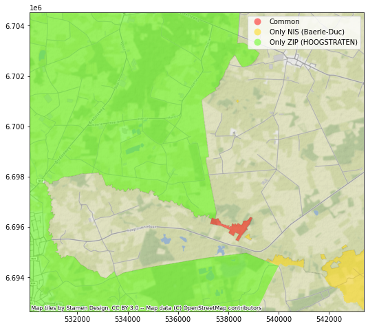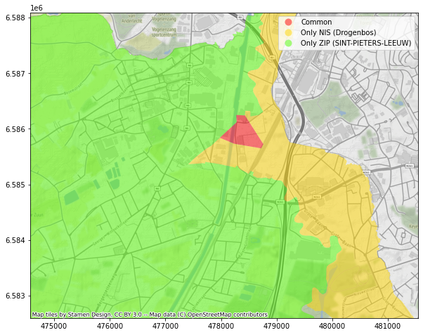 Avec la jointure spatiale, nous allons pouvoir, sur base d’un dataset contenant les frontières des communes postales et un autre contenant les frontières des communes statistiques, réaliser 3 opérations :