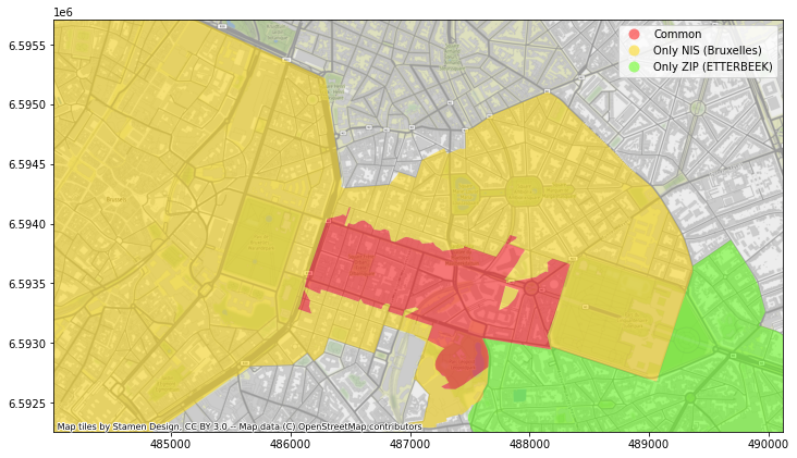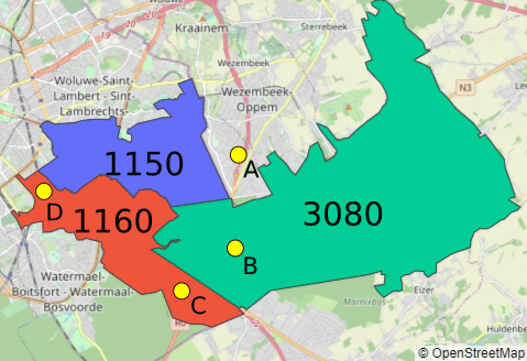 Par exemple, à Bruxelles, tout le quartier autour de “Schuman” et “Maelbeek” fait partie de la commune d’Etterbeek selon les données postales, alors qu’il fait partie de la commune de Bruxelles-ville selon les données statistiques. Google maps et OpenStreetMap sont du même avis que les données statistiques, alors que Here et Bing se rangent du côté des données postales ! Dans la pratique, les plaques de rue visibles sur StreetView semblent contredire les données postales.
