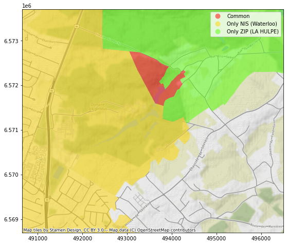 Dans ce premier exemple, nous avons comparé deux datasets concernant les codes postaux. Un premier dataset, fourni par bpost (la poste belge) qui reprend les frontières de chaque code postal, et un autre, fourni par l’Agence du Numérique qui reprend le centre de chacune des combinaisons code postal – localité. Dans le premier, si un code postal est partagé par plusieurs localités, nous n’aurons qu’un polygone pour ce code postal. Alors que dans le second, nous aurons le centre de chaque localité, chacune d’elle devant se trouver, en théorie, au sein du polygone correspondant.