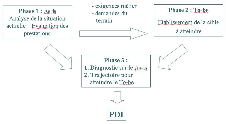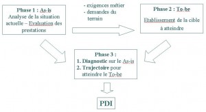 – l’analyse des écarts entre le as-is et le to-be (le diagnostic)  et la détermination des actions à mener pour atteindre la cible, soit la trajectoire as-is – to-be, qui se traduira en termes d’investissements et de projets de différentes natures, les vrais délivrables du PDI.