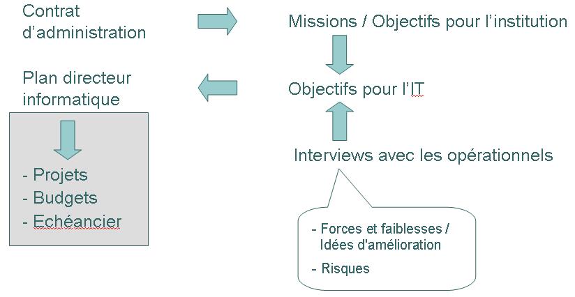 L’approche top-down vise à recueillir les besoins exprimés par les responsables de services, en regard des missions et objectifs de l’Institution exprimés dans le contrat d’administration. L’approche top-down vise aussi à recueillir les engagements de l’Institution vis-à-vis des partenaires.