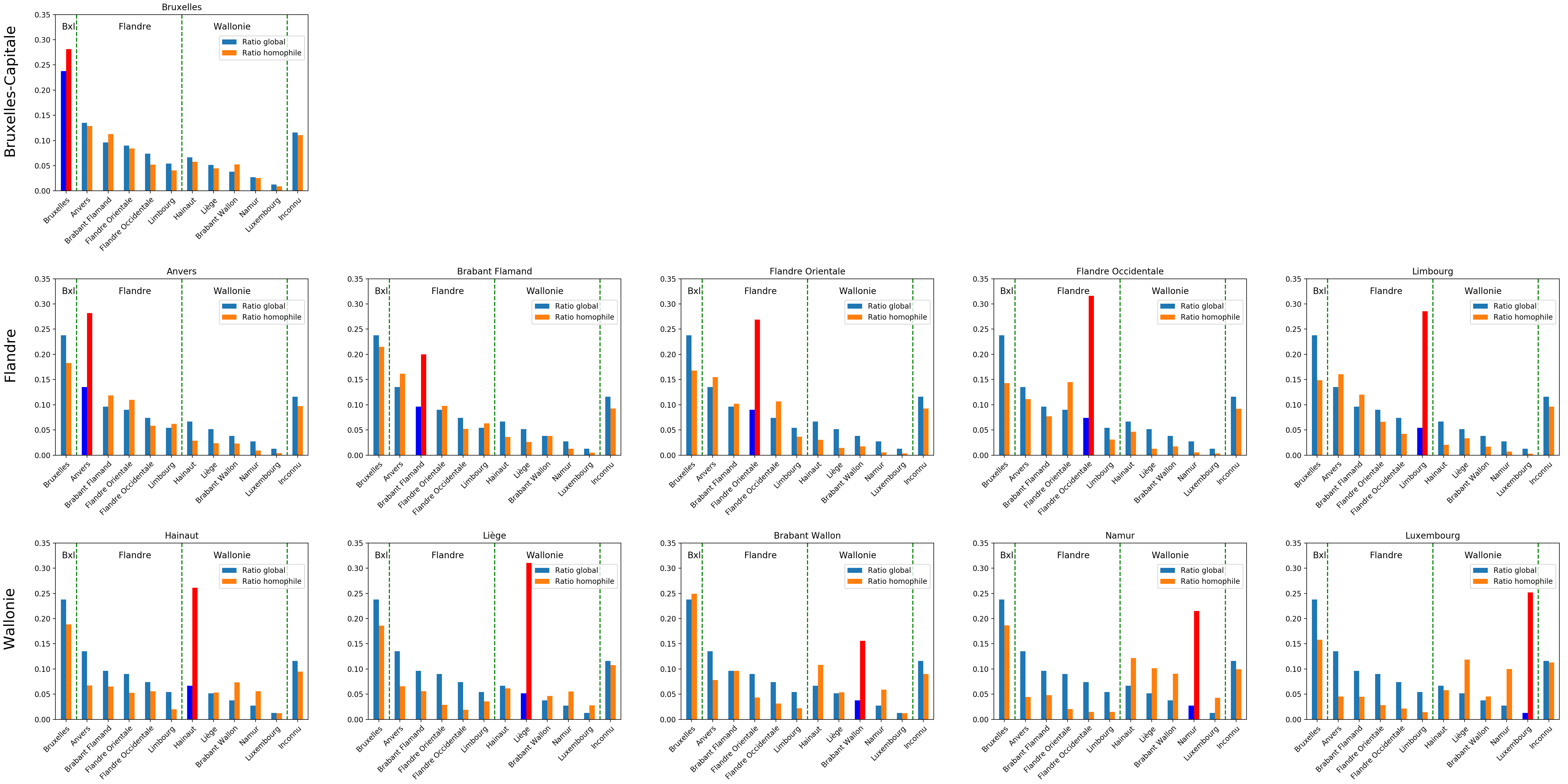 Si l’on veut une vue plus détaillée de cette notion d’homophilie provinciale, on peut aussi comparer, pour chaque province P, les deux répartitions suivantes :
