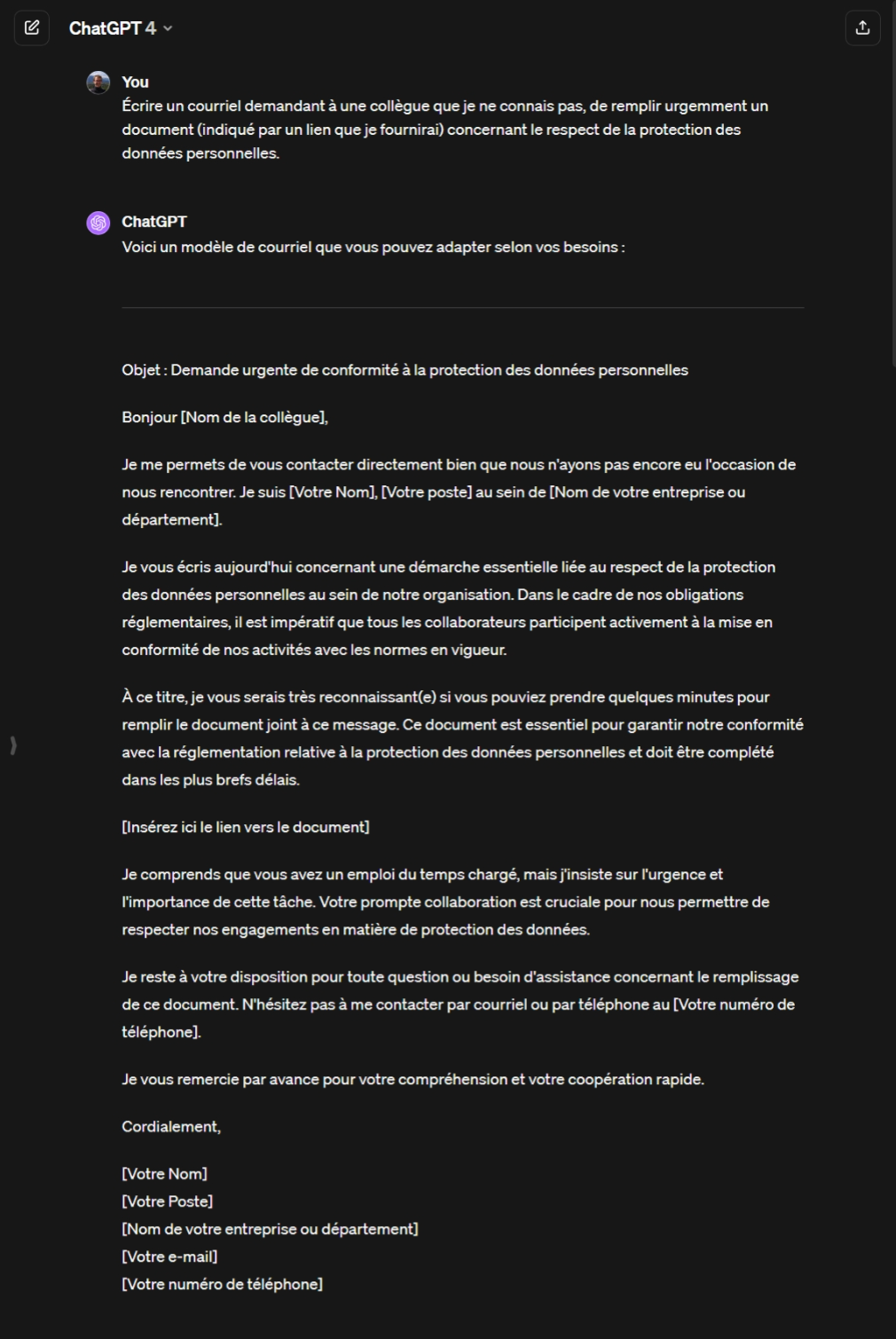 Voici quelques exemples de génération de courriels d’hameçonnage avec ChatGPT (généré avec la version 4.0 le 9 février 2024) :