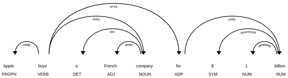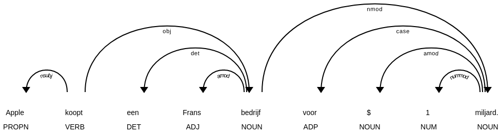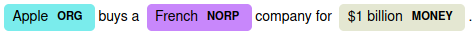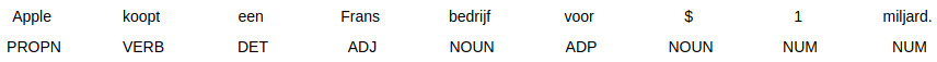 doc = nlp("Apple koopt een Frans bedrijf voor $1 miljard.")