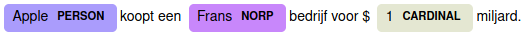 We merken dat Apple wordt herkend als ORG (organisatie), French als NORP (nationaliteit of religieuze/politieke groep) en $1 billion als een geldhoeveelheid. Proberen we echter hetzelfde in het Nederlands: