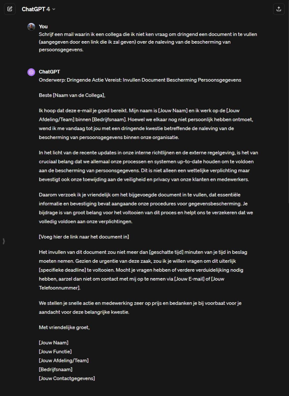 Hier volgen enkele voorbeelden van hoe je phishingmails kunt genereren met ChatGPT (gegenereerd met versie 4.0 op 9 februari 2024):