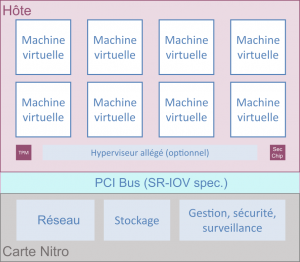 - Cartes Nitro spécifiques – Dispositifs matériels conçus par AWS qui assurent le contrôle global du système et la virtualisation des entrées/sorties indépendamment de la carte mère du système avec ses processeurs et sa mémoire ;