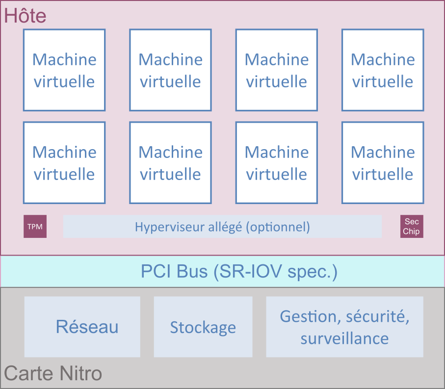 Le système AWS Nitro (Figure 2) s’inscrit dans une refonte de l’infrastructure de virtualisation du service EC2 d’Amazon, notamment réduire au maximum les parties de l’hyperviseur fonctionnant sur la carte mère. Le système AWS Nitro est une combinaison de serveurs, de processeurs, de composants de gestion et de micrologiciels spécialisés qui fournissent la plate-forme sous-jacente pour toutes les instances Amazon EC2. Il se compose de trois éléments principaux :