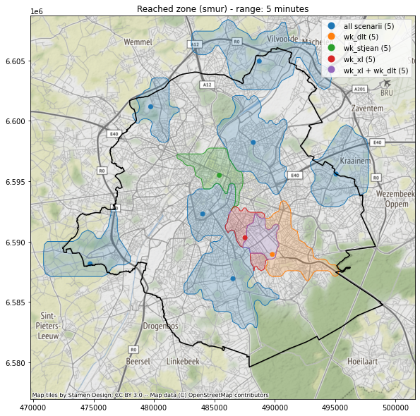 Pour chaque durée, nous pouvons maintenant comparer les différents scénarios, nous permettant d’identifier, les zones communes, accessible dans le délai donné quel que soit le scénario, et les zones distinctes, uniquement accessible dans un des scénarios dans le délai donné.