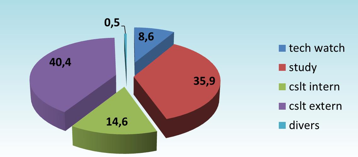 In 2018 zullen de consultancyactiviteiten 55% van onze tijd in beslag nemen. Circa 36% wordt gespendeerd aan onderzoeksprojecten en 8,6% aan technology watch en permanente vorming.