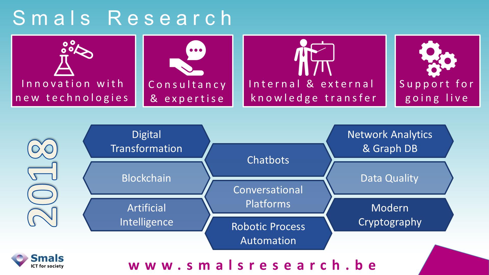 Via de voorgestelde studies wordt er gepeild naar opportuniteiten voor Smals en de klanten en bouwen we verder op de studies die in het verleden gevoerd werden, wat ons toelaat om concrete toegevoegde waarde te bieden. In 2018 wordt er speciale aandacht besteed aan het in gebruik laten nemen van de door ons voorgestelde technologieën en concepten.