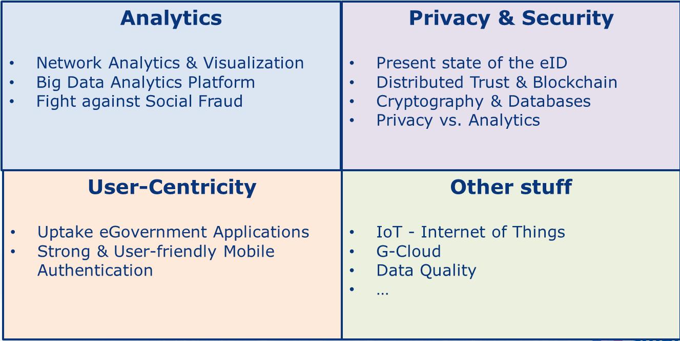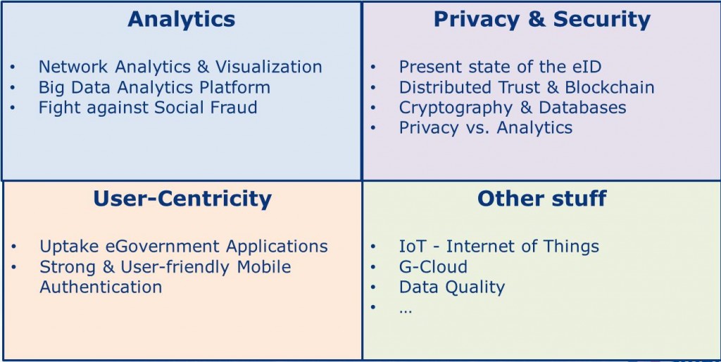 De studie “Privacy vs. Analytics” heeft als doel na te gaan hoe en in welke mate analytics verenigbaar is met het kruisen en gebruiken van gevoelige persoonsgegevens afkomstig van verschillende overheidsinstellingen. Bij deze studie, opgestart in 2015, werd er waardevolle expertise en praktische ervaring opgebouwd rond state-of-the-art cryptografie zoals Elliptic Curve Cryptography (ECC). Het resultaat van de studie is een origineel concept uitgewerkt door het research team en gevalideerd door experten van de KUL en UA. In 2016 wordt er een proof-of-concept voorzien, naast de publicatie van een wetenschappelijke paper (Proceedings on Privacy Enhancing Technologies) en een meer toegankelijke research note en infosessie.