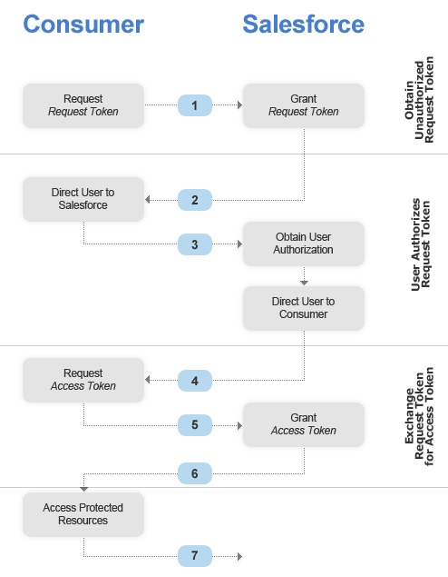 Het principe van OAuth is vrij bekend aangezien het sterk lijkt op processen in federatiestandaarden zoals SAML en WS-Trust. Er zijn drie partijen: de client, de resource owner en de server, respectievelijk user, consumer en Salesforce in de figuur. De client is een stuk software of een dienst die toegang wenst tot resources op een server.