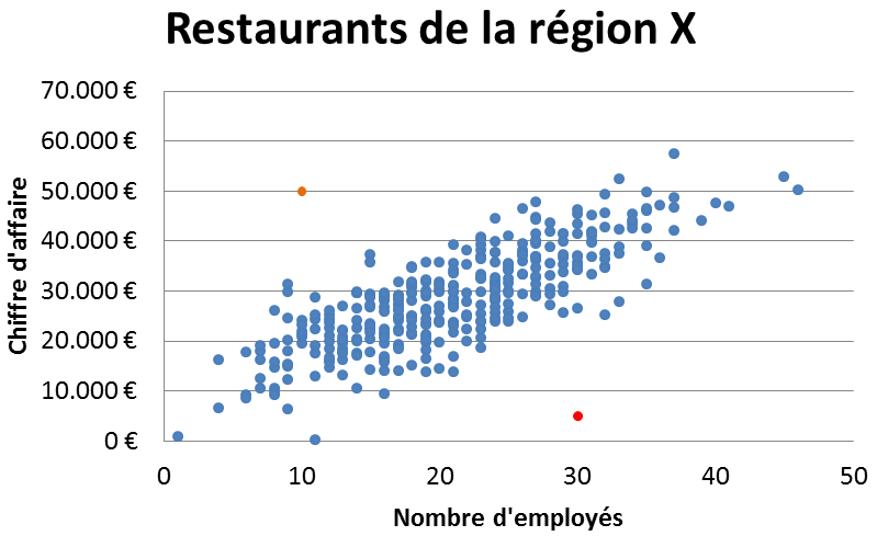 Dans l’exemple ci-contre, le point orange en haut à gauche représente un restaurant ayant soit un chiffre d’affaire particulièrement élevé (par rapport à son nombre d’employés), soit un nombre d’employés très bas (par rapport à son chiffre d’affaire). On pourrait dès lors suspecter qu’une partie du personnel ne soit pas déclaré, voire, pire, que du blanchiment d’argent soit en cours dans ce restaurant.