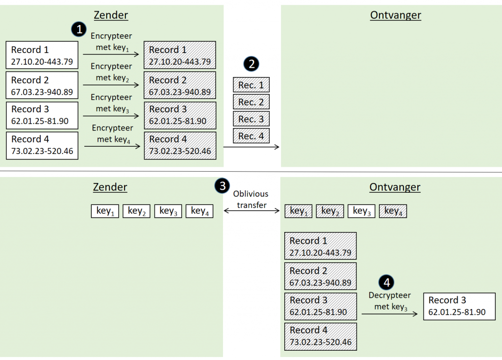 Oblivious transfer werd voor het eerst – in een wat zwakkere vorm – beschreven in 1981 en er is sindsdien veel onderzoek naar gebeurd in de academische wereld. Ondertussen is het – volgens de inschatting van de auteur – voldoende rijp om ook in overheidscontext gebruikt te worden. Het bestaat in verschillende varianten, waaronder 1 uit 2 oblivious transfer, 1 uit n oblivious transfer en k uit n oblivious transfer. In de eerste variant krijgt de ontvanger toegang tot één uit een set van twee records. In de tweede en derde categorie krijgt de ontvanger toegang tot respectievelijk 1 en k records uit een set van n records. Het idee is vrij eenvoudig; de zender vercijfert alle records in de set, verstuurt alle vercijferde records naar de ontvanger, waarbij het oblivious transfer protocol cryptografisch (wiskundig) afdwingt dat de ontvanger er maar 1 (of k) kan decrypteren.
