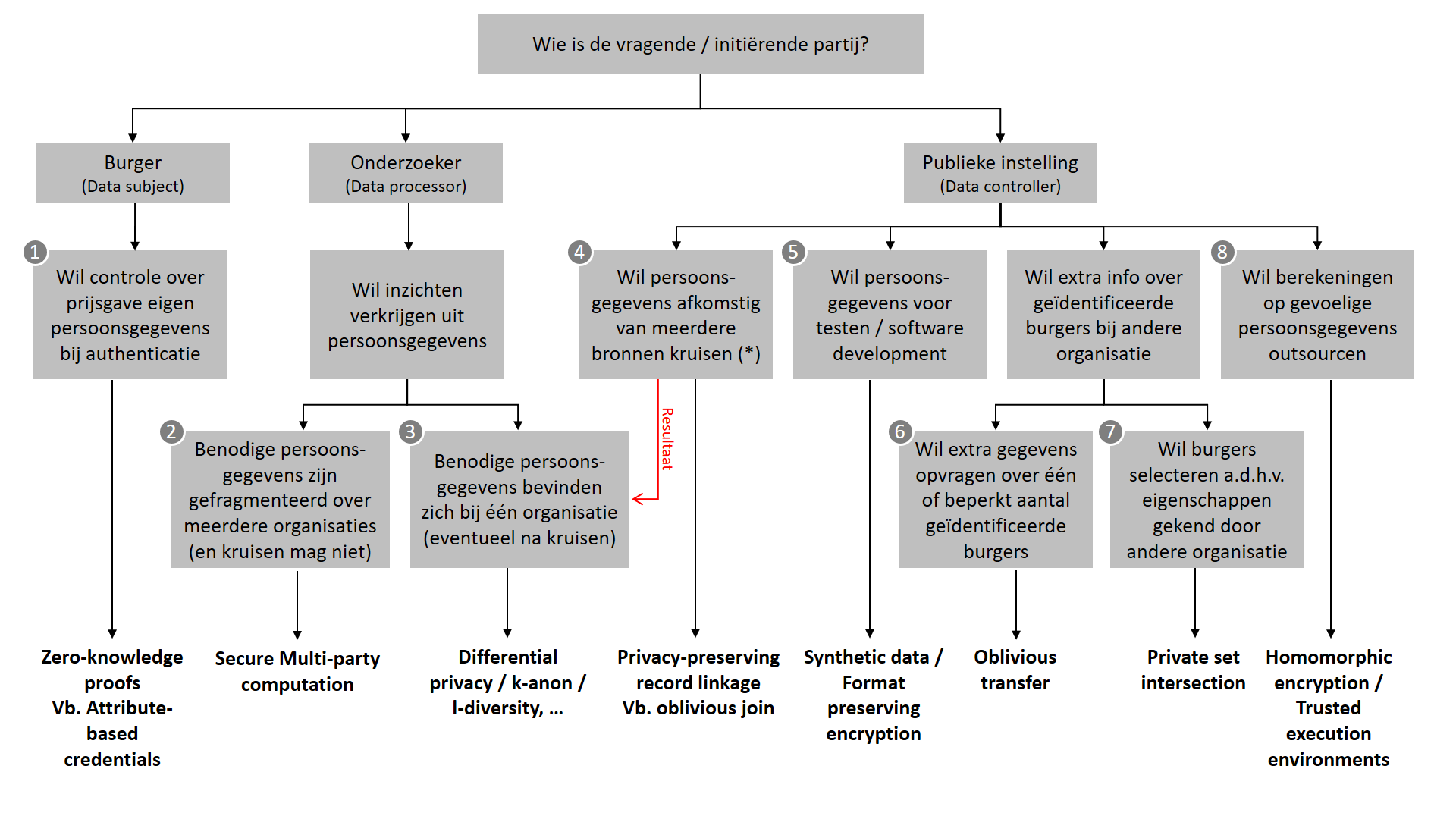 Onderstaande figuur geeft onze eigen, adviserende PET-selectieboom weer, die focust op behoeften vanuit de publieke sector. De boom heeft (momenteel) acht bladeren, die elk een groep van use cases voorstellen. Elk van deze bladeren wordt onder de figuur toegelicht. Voor details over de PETS zelf voorzien we doorverwijzingen/links.